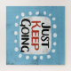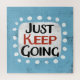 "Just Keep Going" is a super cute motivational inspirational typography design on light blue with white accent trim.