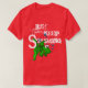 A Cute cartoon fish with a shark in the background with the words "Just keep swimming" on a t-shirt.