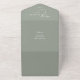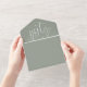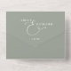 This all-in-one minimalist wedding invitation features elegant typography on a sage green background. The invitation includes a perforated RSVP card with your wedding website QR code. Designed by Thisisnotme©