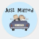 Bride and Groom in a car after the wedding.  Great T Shirts and gifts for the bride and groom to be.  Great T shirts mugs, buttons, hats  and totes for the honeymoon.