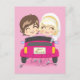 Groom and bride driving a pink automobile with a just married car plate and cans tied to bumper. Celebrate your wedding day with this cute and original design by Kakigori Studio.