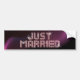 Customisable bumper sticker for recently married couple with glittering "Just Married" text design on pink jewel-like flashy letters and silky purple background.
