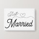 Just Married—fun wedding and honeymoon buttons (pins) for bride and groom. Announce your newlywed status to everyone. Elegant script font with a cute heart illustration. Simple and sweet black lettering.