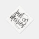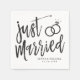 A fun and unique script lettered napkin tailored specifically to you a post-nuptial party. It features the words "Just Married" with wedding rings resting over it. Underneath this and above it are the names of the bride and groom and the wedding date.