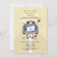 An adorable invitation featuring the newlyweds driving away in a convertible with a "just married" sign and cans tied to the back of their car. The bride is about to toss her bouquet as she drives away.