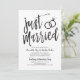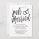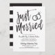 After the big day and the rings are exchanged invite your most honoured guests to a celebration. This invitation features the words "just married" in fancy script letters. Towards the side of this are a pair of wedding rings. Underneath this unique graphic is a space for your own words and information for your