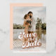 A wedding save the date with a custom photo and rose gold foil printed retro style typography is a unique and stylish way to announce your upcoming nuptials to your friends and family. The custom photo is a special touch that adds a personal and sentimental element to the design, while the rose gold foil printing adds a touch of glamour and sophistication. This design is sure to impress and get everyone excited for your big day.