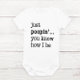 Introducing our playful “Just Poopin'... You Know How I Be” baby one-piece bodysuit, designed for tiny trendsetters with a sense of humour! Made from ultra-soft, breatheable fabric, this bodysuit ensures your little one stays comfy while delivering laughs.