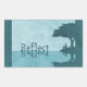 A green-blue textured drawing featuring the silhouette of a man sitting under a tree by a pond contemplating. The word "Reflect" rests on the lake's surface, the text and shadows reflected in the perfectly still water.