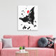 Check out this noir style comic art of Justice League's Batman leaping through the air amongst a cloud of bats. This black and white pop art is offset by a bright red moon in the sky.