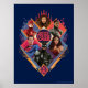 This diamond hatch design features the members of the Justice League in the panels surrounding the Justice League logo. Check out Aquaman in his trident themed panel, Cyborg and The Flash in digital themed panels, and Superman, Batman, and Wonder Woman in bold coloured panels. This graphic is framed with electronic circuits and lightning bolts, and the Justice League JL shield logo is positioned at the bottom centre.