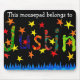 A good quality mousepad with a colourful handpainted paper collage design saying 'This mousepad belongs to Justin' on a black background. See also matching greeting card and gifts.