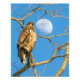 A juvenile bald eagle perched on a branch with a three quarter moon in the backround.