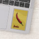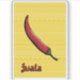 A red jwala chilli pepper, also known as an Indian hot finger pepper, is decorated with patterns inspired by Indian mehndi and sits on a yellow background with a smaller version of the same pattern and a script label in the corner. This moderately spicy pepper is used to add heat to authentic curries and other Indian cuisine.