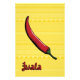 A red jwala chilli pepper, also known as an Indian hot finger pepper, is decorated with patterns inspired by Indian mehndi and sits on a yellow background with a smaller version of the same pattern and a script label in the corner. This moderately spicy pepper is used to add heat to authentic curries and other Indian cuisine.