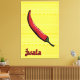 A red jwala chilli pepper, also known as an Indian hot finger pepper, is decorated with patterns inspired by Indian mehndi and sits on a yellow background with a smaller version of the same pattern and a script label in the corner. This moderately spicy pepper is used to add heat to authentic curries and other Indian cuisine.