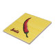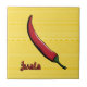 A red jwala chilli pepper, also known as an Indian hot finger pepper, is decorated with patterns inspired by Indian mehndi and sits on a yellow background with a smaller version of the same pattern and a script label in the corner. This moderately spicy pepper is used to add heat to authentic curries and other Indian cuisine.