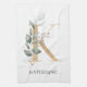 Letter K monogram floral. Letter K in golden brown texture accented with green watercolor compound leaves and berries and gold dust. Personalised with name in matching font.