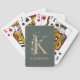 Letter K monogram floral. Letter K in golden brown texture accented with green watercolor compound leaves and berries and gold dust. Personalised with name in matching font. Set on dark mineral green.
