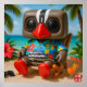 The figure is standing on a white sand beach with turquoise water and palm trees in the background. It's wearing a blue Okinawaian shirt with the Japanese characters on it, along with a pattern of hibiscus flowers, palm trees, and ocean waves. The figure also wears red shorts and sandals. The bird itself has a grey body, large black eyes, and an orange beak.