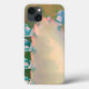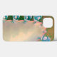 The abstract image on this iPhone 13 Case is an original photograph by MaeFlowers of a kalanchoe plant. The photo is a closeup, showing the new growth at the edge of the leaf, the little curled parts which fall off and become new plants. The leaf, normally bluish green in colour, is aqua blue with pink edges and light yellow highlights. The older leaves in the background are dark to light green, with flecks of vermilion red, fading to pale orange.