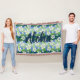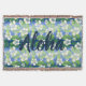Royal blue, ocean blue, cornflower, palm and lime greens colorway. Whimsical hibiscus and plumeria flowers dance on top of tonal palm leaves on a striped tie-dyed blend of colours. This design was inspired by the Aloha shirts and tropical designs for the seventies and flower power. This design comes in several colour ways. Customise the greeting!