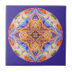 This tile is printed with a marbled kaleidoscope pattern in blue, gold, orange, yellow, and white.