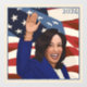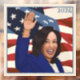 Portrait of the presidential candidate Kamala Harris with the stars and stripes and the wind behind her.