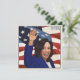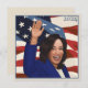 “Portrait of the presidential candidate Kamala Harris with the stars and stripes and the wind behind her.