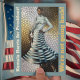 Kamala Harris for President! We're not going back!" postcard featuring a striking painting of a strong African American woman, confidently standing with a cat by her side. She wears a knee-length dress adorned with bold light blue and dark grey horizontal stripes that create an optical illusion, revealing a gold and white pattern. Her intricate dress accentuates her silhouette, embodying both elegance and power. The background showcases a complex, textured pattern that harmonises with the vibrant colours and forms, making this postcard a captivating statement of resilience and leadership.