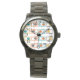 This women's watch has a Kandinsky inspired mid-century modern design of sets of rectangles formed by a continuous line each with an oval inside in retro colours of orange, brown, gold, and turquoise on a white background. If you like the design but prefer different colours, message me.