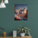 A powerful kangaroo bounds across the red neon outback, engineered with muscular alloy limbs, glowing circuit seams, and illuminated tail balance lines. Crimson, orange, cyan, and gold energy shine across its athletic form while dust kicks beneath each leap. Desert rocks, distant mesas, dry scrub, glowing road markers, heat haze, and a futuristic sunset sky create a striking cinematic landscape. This energetic Australian-inspired design is perfect for gaming rooms, offices, studios, and wildlife lovers seeking bold modern style.