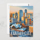 A vintage-style travel poster featuring the iconic Kansas City skyline. The image showcases the city's distinctive skyline ,The poster is designed in a retro style with a vibrant colour palette and a nostalgic feel.