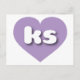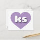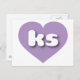 This postcard features a shapely and vibrant lavender heart containing the bold, white, rounded lower case letters ks, a playful abbreviation for Kansas, the sunflower state. The reverse side of the postcard is blank, awaiting your handwritten sentiments or customised text.