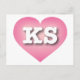 This postcard features a calm, cool, and collected pink heart with a white washed centre containing the bold white upper case letters KS, the official abbreviation for the state of Kansas, the sunflower state. The reverse side of the postcard is blank awaiting your customised text or hand written sentiments.