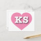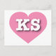 This postcard features a vibrant pink heart containing the bold, white, upper case letters KS, the official abbreviation for Kansas, the sunflower state. The reverse side of the postcard is blank, awaiting your handwritten sentiments or customised text.