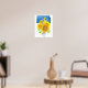 A poster decorated with a western meadowlark bird in a field of bright blooming sunflowers in summer over the state shape in royal blue drawn with pen and ink and painted with watercolor. Inspired by the state bird and state flower of Kansas. Great for college dorm room decor or anyone who loves "The Sunflower State!"