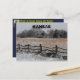 A shot of a Kansas Wooden Fence with snow and tree's and Prairie grass.