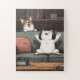 A cosy living-room scene where a chubby cat in oversized headphones belts out a tune while a cheerful corgi howls along from behind the couch. Warm colours, cute expressions, and fun details (turntable, cables, books) make this a delightful build for families, kids, music fans, and pet lovers. Choose your preferred size and piece count on Zazzle.