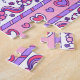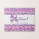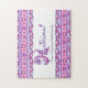 Personalised letter K monogram name and meaning jigsaw puzzle. Pretty hand-drawn initial letter K monogram name and meaning girls jigsaw in purple, pink and white. Ideal for a personalised gift for a girl who has a name that starts with the letter K. This example reads Katrina Pure. A precious tender beauty or you can customise the text with your own name and message or words. Makes a unique girl's birthday, or holidays gift. © Typographic letter K flowers and hearts hand drawing and pattern uniquely created by Sarah Trett. www.sarahtrett.com for www.mylittleeden.com