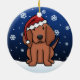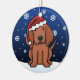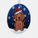Cute Redbone Coonhound Christmas Ornament, drawn in kawaii cartoon! This adorable dog breed is wearing a red Santa hat, and snowflakes are falling all around him. Absolutely darling, perfect for the dog lover's Xmas tree!