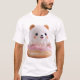 Adorable white puff bear perched on a pink frosted donut with sprinkles. Soft pastel hues, kawaii charm, and a food-inspired motif ideal for kidswear, plush merch, or playful stationery.