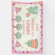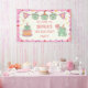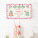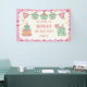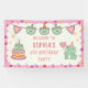 Adorable fun birthday party banner featuring a cute kawaii green frog with a candle on his head, poking out the top of a birthday cake. The cake has yellow sponge, red jam and pink icing with sprinkles, sitting on a purple plate. The frog is green and has a sweet smile on his face. Another happy green frog holding a pink heart shaped balloon wearing a party hat and a string of flags across the top of the banner with flags and happy frog faces. Text reading "Welcome to Sophia's 4th Birthday Party" is in the centre of the banner this is a template you can easily change using the tool provided to custom your banner for the perfect party message. The background is a white icing on a pink border with colourful dots to decorate.