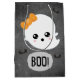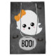 Cute Halloween gift bag featuring a smiling ghost with rosy cheeks, an orange bow, and “Boo!” text on a dark background. Perfect for kids’ Halloween party favours, classroom treats, or handing out candy on trick-or-treat night. A fun and family-friendly design for Halloween.