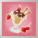 Vanilla ice cream scoops with chocolate icing and hot pink backgroud.