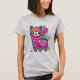 This t-shirt design features an adorable, cartoonish llama with a vibrant and playful appearance. The llama is depicted with a fluffy, pink wool coat that has whimsical swirls and curls, giving it a lively and dynamic look. Its cheerful face is adorned with big, expressive eyes and a cute smile, enhanced by rosy cheeks. The llama stands proudly, surrounded by colourful, abstract flames in shades of blue, orange, yellow, and white, adding a magical and energetic aura to the design. The overall style is reminiscent of kawaii (cute) art, making it appealing to both children and adults who appreciate fun and whimsical illustrations. The bright colours and playful details stand out, creating a visually striking and cheerful t-shirt design.