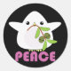 A cute necklace featuring a kawaii dove with an olive branch in her beak featuring two cute smiling olives above the word “Peace “in purple Bahaus 93 font. Great for lovers of peace, doves, olives, and kawaii!