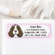 These adorable English Springer Spaniel address labels have a pink chequered background. A liver and white cartoon English Springer Spaniel is on the right, and you can instantly personalise the name and address found on the right. Very cute pet lover products at Menagerie Mayhem.
