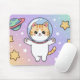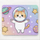 Cute cartoon cat floating in space inside a round bubble-style helmet surrounded by pastel planets and stars.