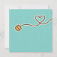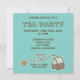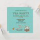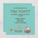 This adorable tea party invitation card features a cute cartoon tea bag character with a smiling face. The string of the tea bag creates a heart shape and in the end of the string there reads "tea". The background colour is turquoise blue with a light polka dots pattern.